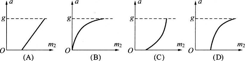 56.如图所示,一轻绳通过一光滑定滑轮,两端各系一质量为m1和m2的物体,m1放在地面上,当m2的质量发生变化时,m1的加速度a的大小与m2的关系大致如下图所示中的图( )。