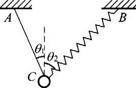 57.如图所示,一个轻弹簧,B端固定,另一端C与细绳一端共同拉着一个质量为m的小球,细绳的另一端A也固定,且AC、BC与竖直方向的夹角分别为θ1和θ2,则烧断细绳的瞬间,小球的加速度a1=______,弹簧在C处与小球脱开时小球的加速度a2=_____。