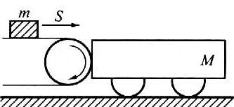 60.如图所示,传送带上表面水平运动,可以把质量m=20 kg的行李包沿水平方向送上平板小车的左端。小车的质量M=50 kg,原来静止停在光滑的水平面上,行李包与小车平板间的动摩擦因数是0.4,小车长1.5 m。如果传送带将行李包以v1=2.8 m/s的速度送上小车,问在这种情况下,行李包在小车上相对于平板车滑行的时间是多少 ?