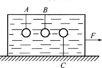 63.如图所示,在光滑水平面上有一密闭水箱,A、B、C三个小球的密度分别为:ρA>ρ水,ρB=ρ水,ρC<ρ水,均用细线系在水箱中开始时,水箱静止,细线竖直。现用力向右突然拉动水箱,则( )。