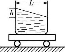64.在水平地面上有一辆运动的平板小车,车上固定一个盛水的烧杯,烧杯的直径为L,当小车作加速度为a的匀加速运动时,水面呈如图所示,则小车的加速度方向为______,左右液面的高度差h为______。