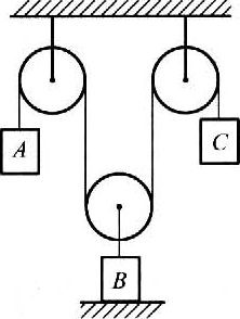 67.如图所示,物体A、B的质量mA=mB=6 kg,三个滑轮质量及摩擦均可忽略不计。物体C与物体A用细绳相连,细绳绕过三个滑轮,试问物体C质量为多少时物体B能够静止不动?