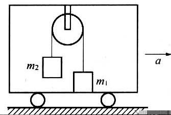 70.如图所示,一条轻绳两端各系着质量为m1和m2的两个物体,通过定滑轮悬挂在车厢顶上,m1>m2,绳与滑轮的摩擦忽略不计。若车以加速度a向右运动,m1仍然与车厢地板相对静止,试问:
