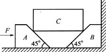 72.如图所示,A、B两个楔子的质量都是8.0 kg,C物体的质量为384 kg,C和A、B的接触面与水平面的夹角是45°,水平推力F=2920 N。所有摩擦均忽略。求 :
