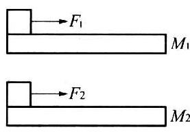 78.如图所示,在光滑的水平面上放着两块长度相等,质量分别为M1和M2的木板,在两木板的左端分别放有一个大小、形状、质量完全相同的物块。开始都处于静止状态,现分别对两物块施加水平恒力F1、F2,当物块与木板分离后,两木板的速度分别为v1和v2。若已知v1>v2,且物块与木板之间的动摩擦因数相同,需要同时满足的条件是( )。