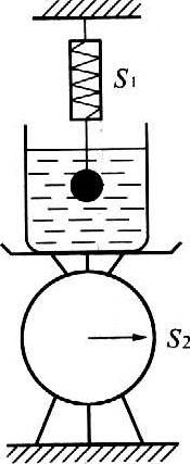 83.如图所示,一密度为ρ0、重力为W1的铁块悬挂于弹簧秤S1上,并全部浸入密度为ρ的液体中,若液体及杯共重W2,全部置于磅秤S2上。