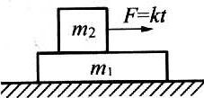 质量分别为m1和m2的木块重叠后放在光滑的水平面上,如图所示。m1和m2间的动摩擦因数为μ。现给m2施加随时间t增大的力F=kt,式中k是常数,试求m1、m2的加速度a1、a2与时间的关系,并绘出此关系的曲线图。