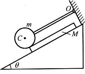 85.如图所示,倾角为θ的光滑斜面上,一个质量为M、长为L的薄木板被一个受轻质杆约束于光滑轴O的质量为m的重球压住不动。已知重球半径为R,重球球心C到光滑轴O之距离也为L,且轻质杆也沿斜面方向(与斜面平行)。现将斜面倾角θ缓缓增加,当增至30°时,薄木板刚好滑动,尔后将斜面倾角突然增至45°且保持不变。试求: