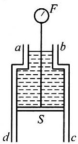 14.如图所示,一圆柱形容器上部圆筒较细,下部的圆筒较粗且足够长,容器的底是一个可以沿下部圆筒无摩擦移动的活塞S,用细绳通过测力计F将活塞提着,容器中盛水.开始时,水面与上圆筒的开口处在同一水平面上,在提着活塞的同时使活塞缓慢地下移,在这个过程中,测力计的示数是( )