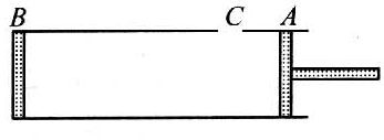 34.如图所示,一个粗细均匀的圆筒,B端用塞子塞住,A端可用一无摩擦滑动的活塞封闭,筒壁C处有一小孔,小孔距B端25 cm。现向B端缓慢移动活塞,若大气压强为1.0×105 Pa,筒内壁的横截面积为1.2 cm2,塞子与筒壁间的最大静摩擦力为18 N,温度保持不变。要使塞子不会被顶出,活塞推到离B端的距离不得小于多少 ?