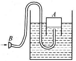 35.如图所示为测定肺活量的装置示意图,图中A为倒扣在水中的开口圆筒,测量前尽量排尽其中的空气。测量时被测者尽力吸足空气,再通过B将空气呼出,呼出的空气通过气管进入A内,使A浮起。已知圆筒A的质量为m、横截面积为S、大气压强为p0,水的密度为ρ,圆筒浮出水面的高度为h,则被测者的肺活量有多大?