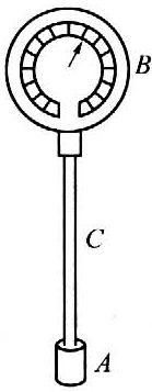 48.如图所示是低温测量中常用的一种温度计的示意图。温度计由下端的测温泡A、上端的压强计B和毛细管C构成。毛细管较长,由不导热的材料做成,两端分别与A和B相通。已知A的容积为VA、B的容积为VB毛细管的容积可忽略不计,整个温度计是密闭的。在室温下,温度计内气体的压强为p0,测温时,室温仍为T0,将A浸入待测物体达到热平衡后,B内气体的压强为p,根据以上已知的温度、压强和体积,请算出待测温度T。