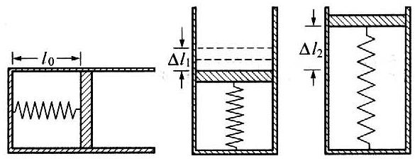 49.一定质量的理想气体被活塞封闭在圆筒形的金属气缸内,如图所示。活塞的质量为30 kg,横截面积为S=100 cm2,活塞与气缸底之间用一轻弹簧连接,活塞可沿气缸壁无摩擦滑动且不漏气。开始时使气缸水平放置,连接活塞和气缸底的弹簧处于自然长度l0=50 cm。经测量,外界气温为t=27℃,大气压强p0=1.0×105 Pa,将气缸从水平位置缓慢地竖直立起,稳定后活塞下降了10 cm,再对气缸内气体缓慢加热,活塞又上升了30 cm,求 :