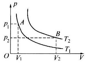 58.对于一定质量的理想气体,有两个状态A(p1,V1)、B(p2,V2),如图所示。它们对应的温度分别为T1、T2。且T1≠T2,图中的曲线为等温线。请你利用理想气体实验定律证明:\(\frac{{{p_1}{V_1}}}{{{T_1}}}\)=\(\frac{{{p_2}{V_2}}}{{{T_2}}}\),要求在图上标出与证明过程相应的状态变化图线。