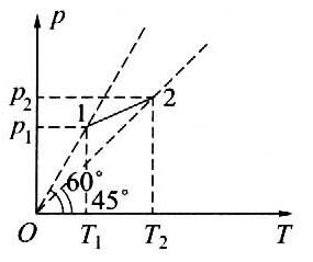 63.在一容积不变的容器中装有质量为m1的理想气体,当气体温度由T1升到T2时,压强由p1增至p2,其变化过程如图所示。在变化过程中,一部分气体从容器中漏出,气体的质量变为m2,则m1与m2的比值为多少?