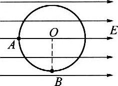 18.如图所示,有一水平方向的匀强电场,场强大小为9000 N/C,在电场内一水平面上作半径为10 cm的圆,圆上取A、B两点,AO沿E方向,BO⊥OA,另在圆心处放一电量为10-8 C的正点电荷,则A处场强大小EA=______N/C,B处的场强大小EB=______N/C。