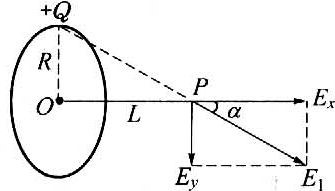 23.如图所示,一半径为 R 的绝缘环上均匀地带有电荷量为 +Q 的电荷,在直于圆环平面的对称轴上有一点 P,它与环心 O 的距离 OP = L,试求 P 点的场强。