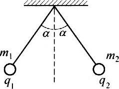 25.如图所示,两个大小相同的小球带有同种电荷,质量分别为m1和m2,带电量分别为q1和q2用细绝缘线悬挂后,因静电力而使两悬线张开,它们与竖直线所成的角度均为α,且两球同处一水平线上,则下述结论中正确的是( )
