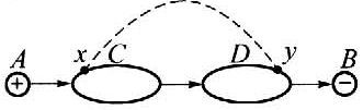 72.图中,A、B为带异种电荷的小球,将两个不带电的导体棒C、D放在两球之间,当用导线将C、D棒上的x、y两点接起来,导体中的电子将向哪个方向迁移?