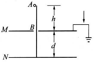 74.如图所示,两块水平放置的平行金属板M、N相距为d,组成一个电容为C的平行板电容器,M板接地,板正中央有一个小孔B,从B孔正上方h处的A点,一滴一滴地由静止滴下质量为m、电荷量为q的带电油滴。油滴穿过B孔后落到N板,把全部电荷量传给N板.若不计空气阻力及板外电场,问: