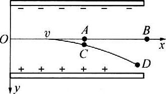 75.如图所示,在两块带电平行金属板间,有一束电子沿Ox轴方向射入电场,在电场中的运动轨迹为OCD。已知OA=AB,则电子在OC段和CD段动能的增加量之比ΔEkC∶ΔEkD为( )