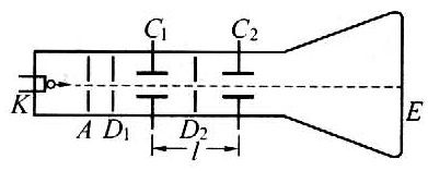 89.现今测定电子荷质比e/m的最精确的方法之一是双电容器法。如图所示,在真空管中由阴极K发射出的电子,其初速度可忽略不计,此电子被阳极A的电场加速后穿过屏障D1上的小孔,然后顺序穿过电容器C1、屏障D2和第二个电容器C2而射到荧光屏E上,阳极与阴极间的电势差为U。在电容器C1、C2之间加有频率为f的同步交变电压,选择频率f使电子束在荧光屏上的亮点不发生偏转,试证明:电子荷质比为\(\frac{e}{m}\)=\(\frac{{2{f^2}{l^2}}}{{{n^2}U}}\),其中l是两电容器间的距离,n为一整数。