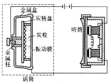 5.电话的话筒可以把声音变化转换为电流变化。炭精话筒的结构如图所示,炭精盘和振动膜之间充满了接触不紧密的炭粒。声音使振动膜振动,改变炭粒接触的紧密程度,使炭粒的电阻发生变化,从而改变电路电流的大小.如果炭粒的电阻能在45~55 Ω的范围内变化,当加在它两端的电压为3 V时,求电路中电流变化的范围。