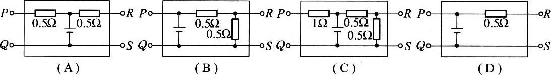 8.有一电学黑箱,内有电池组及定值电阻若干只,以一定方式连接。外有P、Q、R、S四个接头。已知当用电压表测量P、Q间电压时,示数为1.00 V;测量R、S间电压时,示数为0.50 V。当将一电流表跨接在R、S间时,示数为1.50 A(电压表、电流表都可看作为理想的)。图中画出了黑箱内部的四种电路,其中能满足本题所给条件的是图(图中电池组电动势为1.5 V,电池组内阻为0.5 Ω)( )