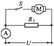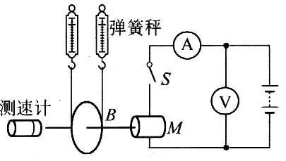 12.如图所示,直流电动机的轴与圆盘中心相连,电键S断开时,电压表的示数为12.6 V。电键S闭合时,电流表的示数为2 A,电压表的示数为12 V。圆盘半径为5 cm,测速计测得转速为50 r/s,两弹簧秤示数各为7.27 N和6.10 N。问: