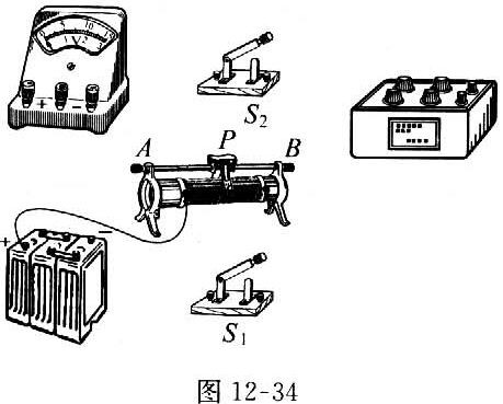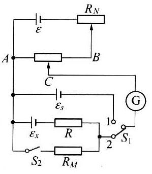 116.如图所示为用电位差计测电池内阻的电路图。实际的电位差计在标准电阻RAB上直接刻度的不是阻值,也不是长度,而是各长度所对应的电位差值。RM=100 Ω,实验开始时S2断开,S1拨到1处,调节RN使通过RAB的电流准确地达到标准值。然后将S1拨到2处,调节C,当灵敏电流计指针指零时,读得UAC=1.5025 V;再闭合S2,滑动C,当电流计指针指零时,读得UAC=1.4455 V。试根据这些数据计算电池εs的内阻r。