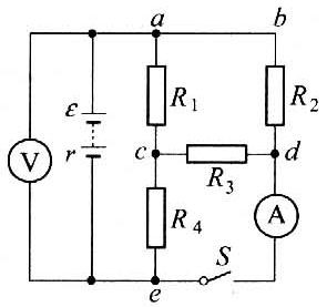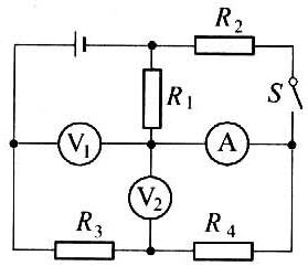 104.如图所示的电路中,电阻R1=12 Ω,R2=R3=R4=6.0 Ω。当电键S断开时,电压表的示数为12 V,全电路消耗的电功率为13 W。问电键S闭合后,电压表及电流表的示数各是多大(电流表的内阻忽略不计,电压表的内阻非常大)?