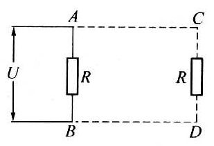 93.如图所示,A、B两端的电压U一定,电阻R先接在A、B两端,消耗功率为9 W。再将电阻R接在较远的C、D两端,消耗功率为4 W。在后一种情况下,输电导线AC、BD共消耗功率为( )