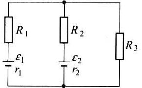 114.如图所示电路中,ε1=6 V,ε2=4.5 V,R1=9 Ω,R2=19 Ω,R3=50 Ω,r1=r2=1 Ω.求分别通过两电源的电流及通过R3的电流。