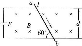 4.水平放置的平行金属导轨相距为d,导轨一端与电源相连,垂直于导轨平面的匀强磁场的磁感应强度为B,方向如图所示。长为l的金属棒ab静止在导轨上,棒与导轨成60°角,此时,通过金属棒的电流为I,则金属棒所受的安培力大小为________。