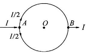 17.如图所示,电流从A点分两路通过对称的半圆支路汇合于B点,在圆环中心O处的磁感应强度为( )。