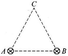 18.两根长直通电导线互相平行,电流方向相同,它们的截面处于等边△ABC的A和B处,如图所示。两通电导线在C处产生磁场的磁感应强度大小都是B0,则C处磁场的总磁感应强度大小是( )。