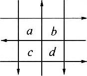 21.在同一平面内放置六根通电导线,通以相等的电流,方向如图所示,则在a、b、c、d四个面积相等的正方形区域中,磁场最强且磁感线指向纸外的区域是( )。