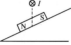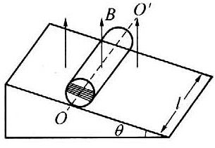 44.如图所示,倾角为θ的斜面上放一木制圆柱,其质量m=0.2 kg,长为l=0.1 m,圆柱上顺着轴线OOʹ绕有N=10匝的线圈,线圈平面与斜面平行,斜面处于竖直向上的匀强磁场中,磁感应强度B=0.5 T。当通入多大的电流时,圆柱才不致往下滚动?
