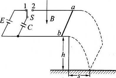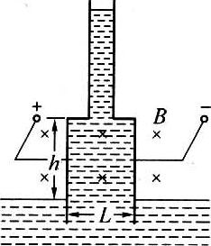 43.如图所示,磁流体动力泵的矩形槽左、右两侧壁是导电极板,前后两壁是绝缘板,槽宽L=5 cm,高h=10.5 cm,槽的下部与水银面接触,上部与一竖直非导电管相连,匀强磁场方向垂直于绝缘壁,B=0.1 T。给两导电极板加一电压U=1 V,取水银电阻率ρ0=10-6 Ω·m,水银密度ρ=1.4×104 kg/m3;求水银在泵中可上升的高度。