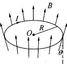 42.如图所示,一个半径为R的导电圆环与一个轴向对称的发散磁场处处正交,环上各点的磁感应强度B大小相等,方向均与环面轴线方向成θ角。若导线环上载有一恒定电流I,试求磁场作用在圆环上安培力的大小和方向。