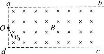 54.如图所示,足够长的矩形区域abcd内充满磁感应强度为B、方向垂直纸面向里的匀强磁场,现从ad边的中心O点处,垂直磁场方向射入一速度为v0的带正电粒子,v0与ad边的夹角为30°。已知粒子质量为m,带电量为q,ad边长为L,不计粒子的重力。