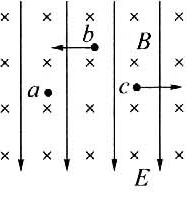 56.如图所示,匀强电场E竖直向下,匀强磁场B垂直纸面向里。现有三个带有等量同种电荷的油滴a、b、c,若将它们分别置入该区域中,油滴a保持静止,油滴b向左水平匀速运动,油滴c向右水平匀速运动,则比较三个油滴所受重力Ga、Gb、Gc的大小,最大的是________,最小的是________。