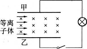 64.目前世界上正在研究的新型发电机磁流体发电机的原理如图所示。设想在相距为d,且足够长的甲、乙两金属板间加有垂直纸面向里、磁感应强度为B的匀强磁场,两板通过电键和灯泡相连,将气体加热到使之高度电离。由于正负电荷一样多,且带电量均为q,故称为等离子体。将其以速度v喷入甲、乙两板之间,这时甲、乙两板就会聚集电荷,产生电压,它可以直接把内能转化为电能。试问: