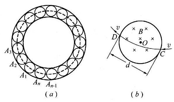 65.我国1989年初投入运行的高能粒子加速器——北京正负电子对撞机是一种现代的新型加速器。正负电子对撞机的最后部分的简化示意图如图所示(俯视图),位于水平面内的粗实线所示的圆环形真空管是正负电子作圆周运动的“容器”,经过加速器加速后的正负电子被分别引入该管道时,具有相等的速率v,它们沿管道向相反的方向运动。在管道内控制它们转弯的是一系列圆形电磁铁,即图中的A1、A2、A3、…An,共n个,均匀分布在整个圆环上,每个电磁铁内的磁场都是匀强磁场,并且磁感应强度都相同,方向竖直向下,磁场区域的直径为d。改变电磁铁内电流的大小,就可以改变磁场的磁感应强度,从而改变电子偏转的角度。经过精确的调整,首先实现电子在环行管道中沿图(a)中粗虚线所示的轨迹运动,这时电子经过每个电磁铁时射入点和射出点都在电磁铁的同一条直径的两端,如图(b)所示。这就为进一步实现正负电子对撞做好了准备。