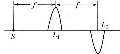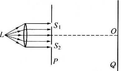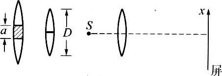 4.将焦距为f=20 cm的凸透镜从正中切去宽度为a的小部分,再将剩下两半粘接在一起,构造一个“粘镜”,如图所示。图中D=2 cm,在粘合透镜一侧的中心轴线上距镜20 cm处置一波长λ=500 nm的单色点光源,另一侧垂直于中心轴线放置屏幕,屏幕上出现干涉条纹,条纹间距Δx=0.2 mm。问:
