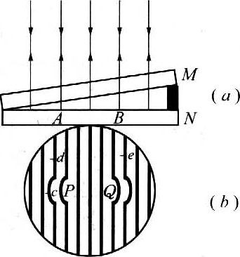 21.利用薄膜干涉可检查工件表面的平整度。如图(a)所示,现使透明标准板M和待检工件N间形成一楔形空气薄层,并用单色光照射,可观察到如图(b)所示的干涉条纹,条纹的弯曲处P和Q对应于A和B处,下列判断中正确的是( )。