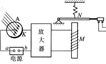 (2)K极发射光电子,电路中产生电流,经放大器放大后的电流产生的磁场使铁芯M被磁化,将衔铁N吸住;无光照射光电管时,电路中无电流,N自动离开M。