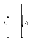 根据左手定则的推论——“同向电流相互吸引,反向电流相互排斥”可知,两导线相互排斥;根据牛顿第三定律可知,这两个斥力等大反向一直线。
