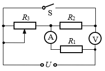 25.如图所示电路中,电阻R1=5Ω,R2=14Ω,R3是总电阻为20Ω的滑动变阻器,滑动片位于中点。电压表和电流表均为理想电表,稳压电源的电压U=12V。