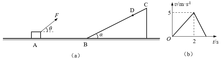 26.如图(a),AB为光滑水平面,BC为倾角α=30°的光滑固定斜面,两者在B处平滑连接。质量m=1.6kg的物体,受到与水平方向成θ=37°斜向上拉力F的作用,从A点开始运动,到B点撤去F,物体冲上光滑斜面。物体在运动过程中的v-t图像图(b)所示。求:(sin37°=0.6,cos37°=0.8,g取10m/s2)